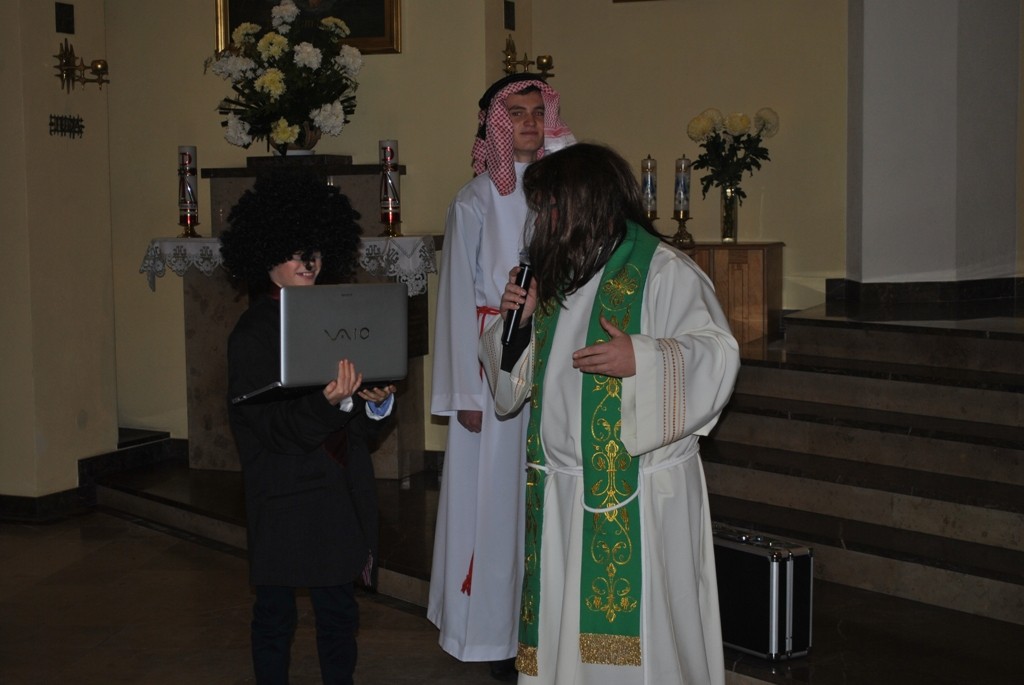 A w naszym kościele o godzinie 12.00 przysiadł też Pan Jezus i przypatrywał się jak dziś ludzie przechodzą obok skarbonki. Oj kto się spodziewał że przybył do nas niejaki Szejk Kalifatu Roponośnego Abdul-Kabdul Olej Napędowy z dwiema ogromnymi walizami pieniędzy. Jego wejście „okraszone” zostało muzyką „Money, Money, Money” zespołu „Abba” – co za trafny wybór. Walizki pełne pieniędzy. Pewnie dolary, euro, petro-dolary, jeny, franki. A ich właściciel wrzuciła do skarbony: 10 Euro! No tego to chyba się nikt nie spodziewał. Człowiek trzymający w ryzach połowę pól roponośnych świata dzieli się 10 euro? No cóż widocznie miał pewnie wiele wydatków.