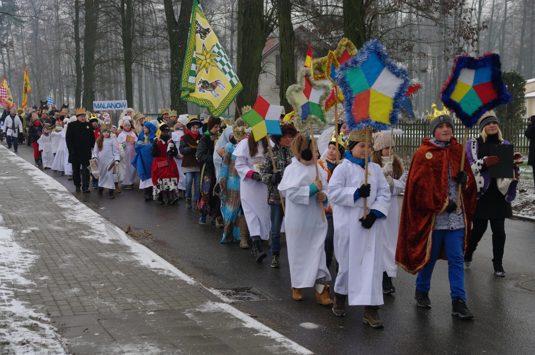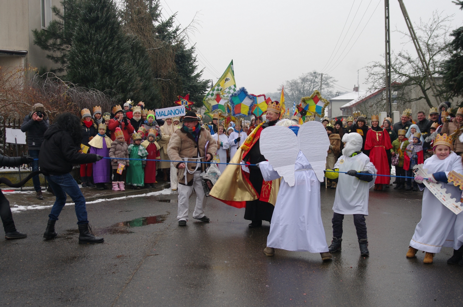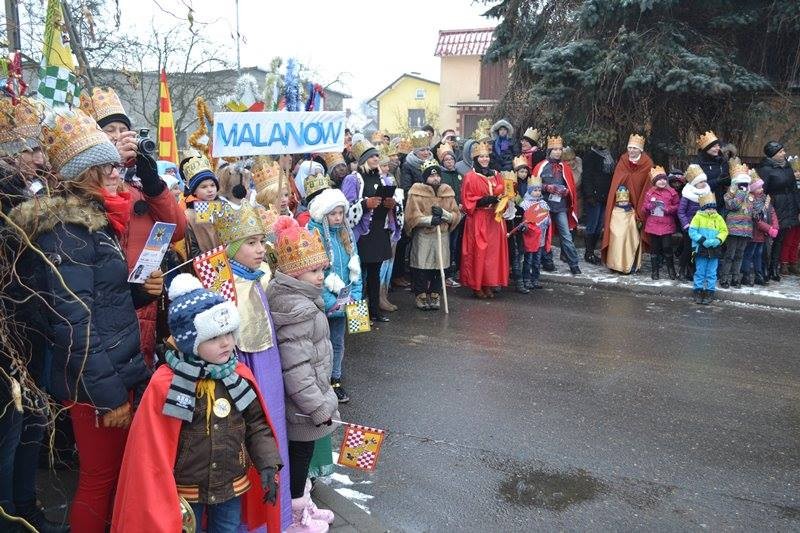 Orszak ruszył z placu przy gimnazjum. Z wielką radością parafianie przyjęli zaproszenie od naszych Duszpasterzy i licznie przybyli przebrani w przygotowanych przez siebie strojach. Przodem szli Trzech Królowie p. Dzieciątkowski, p. Augustyniak i p. Dembiński oraz włodarze naszej parafii i gminy: ks. prałat Stanisław Płaszczyk, p. wójt Sławomir Prentczyński i p. przewodniczący rady Andrzej Toms, których wcześniej ukoronował ks. prefekt - reżyser orszaku. Szły pięknie ubrane dzieci z grupy Kolędników Misyjnych ze Szkoły Podstawowej w Malanowie.