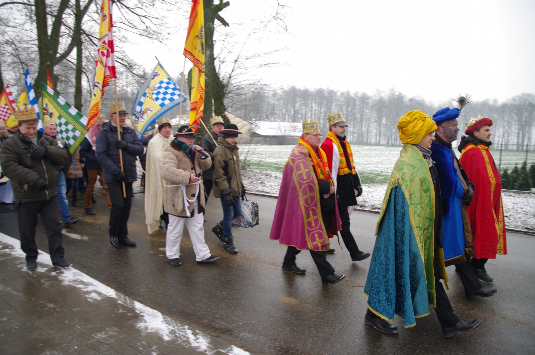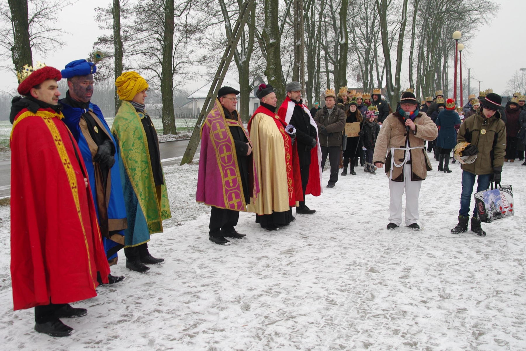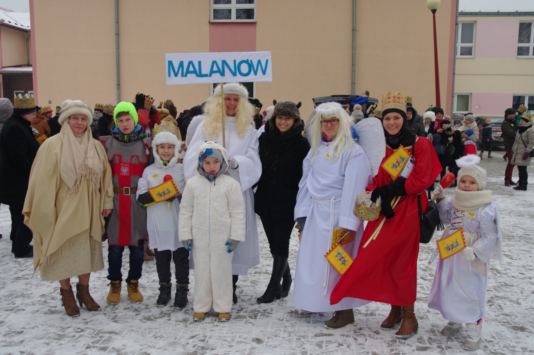 Orszak ruszył z placu przy gimnazjum. Z wielką radością parafianie przyjęli zaproszenie od naszych Duszpasterzy i licznie przybyli przebrani w przygotowanych przez siebie strojach. Przodem szli Trzech Królowie p. Dzieciątkowski, p. Augustyniak i p. Dembiński oraz włodarze naszej parafii i gminy: ks. prałat Stanisław Płaszczyk, p. wójt Sławomir Prentczyński i p. przewodniczący rady Andrzej Toms, których wcześniej ukoronował ks. prefekt - reżyser orszaku. Szły pięknie ubrane dzieci z grupy Kolędników Misyjnych ze Szkoły Podstawowej w Malanowie.
