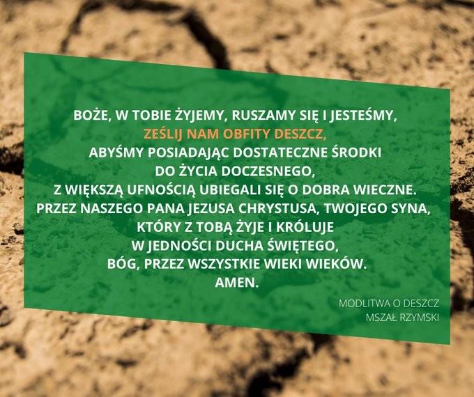 Stąd też Apel przewodniczącego Episkopatu do wszystkich wiernych oraz ludzi dobrej woli o „wytrwałą i żarliwą modlitwę błagalną o deszcz. Proszę, aby w sanktuariach, parafiach, domach zakonnych i rodzinach włączyć tę intencję do naszych modlitwy ufając, że Pan Bóg usłyszy nasze prośby”.