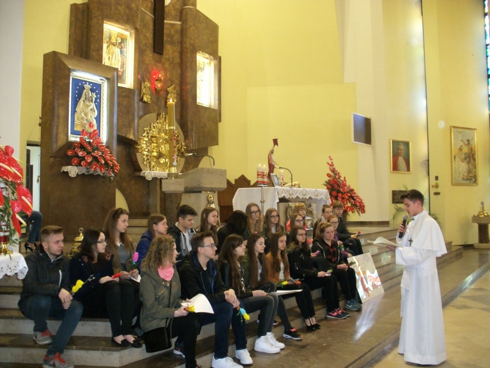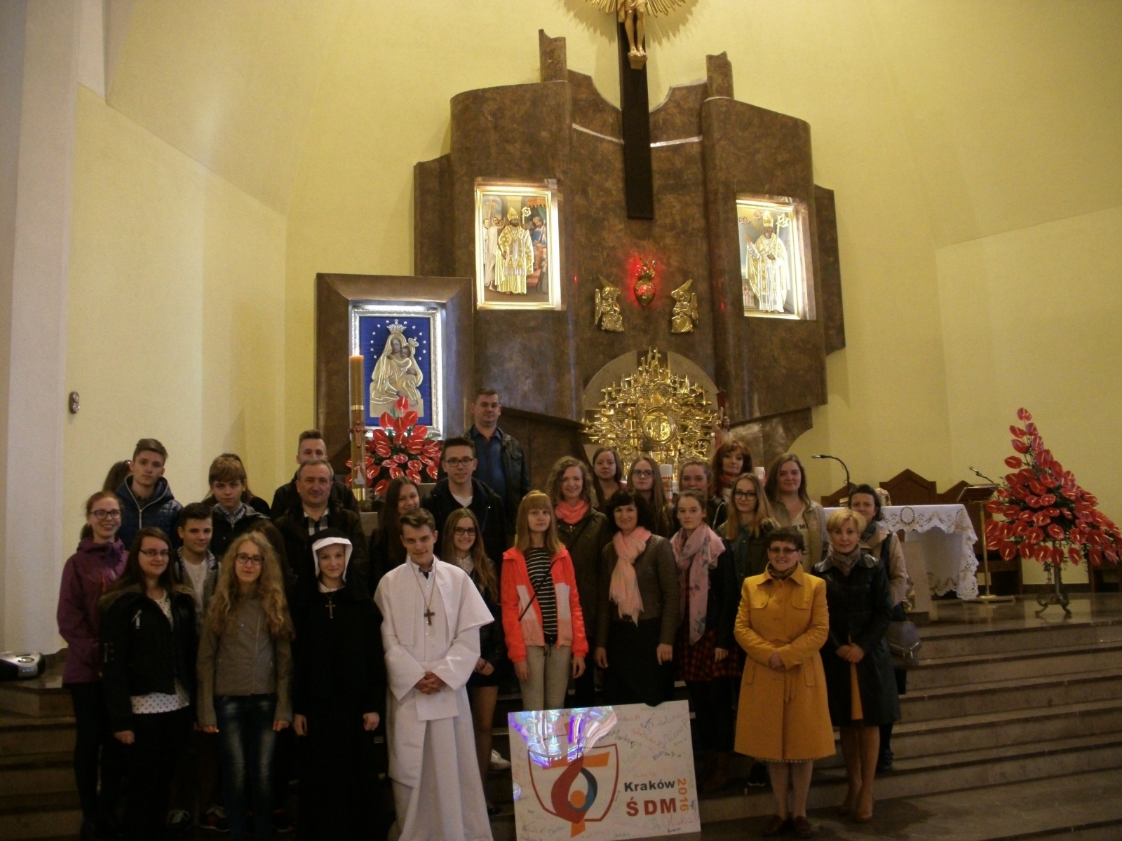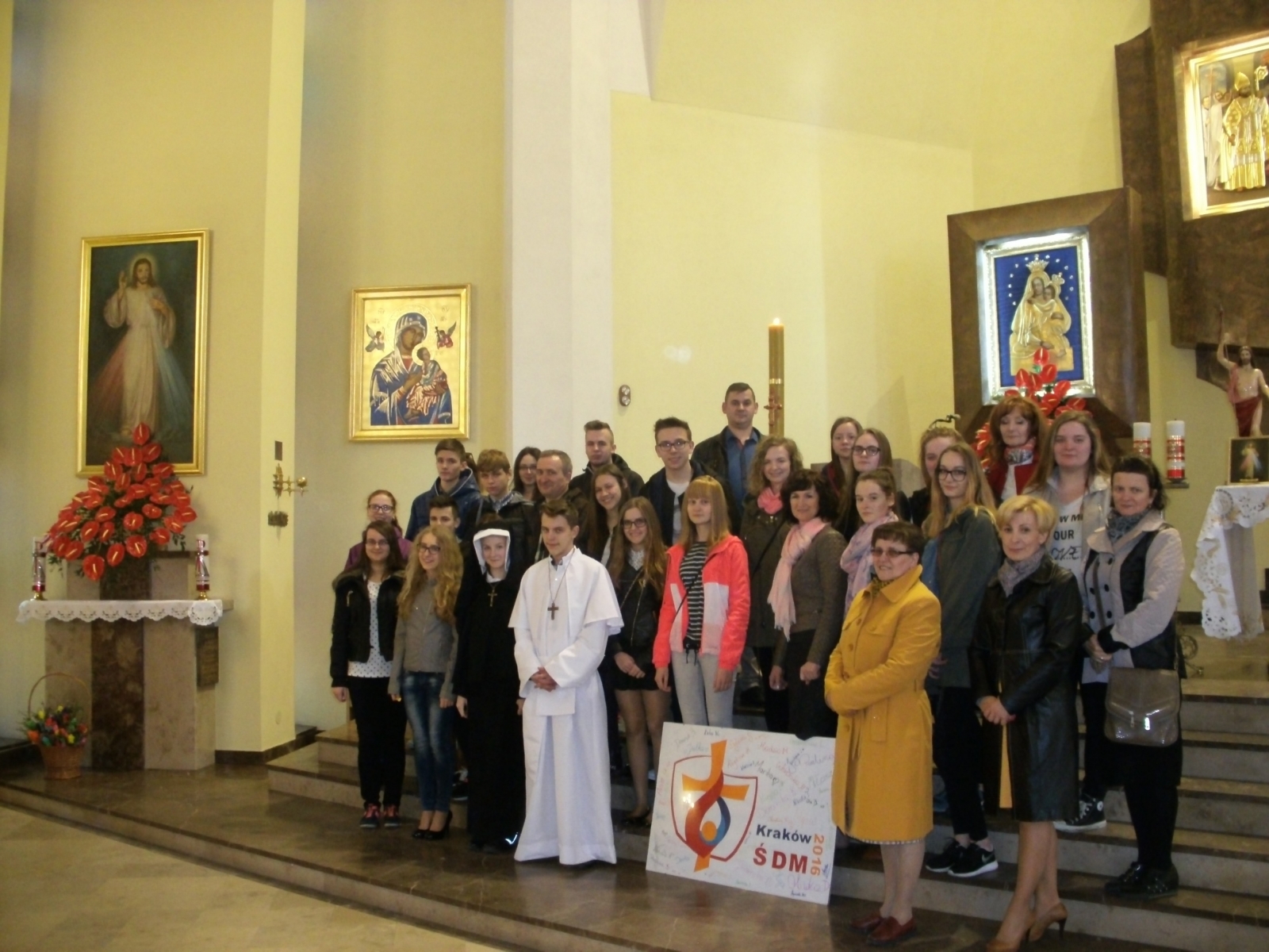 Młodzież naszej parafii przygotowująca się na spotkanie z papieżem Franciszkiem z okazji Światowych Dni Młodzieży w Krakowie uczestniczyła we Mszy świętej celebrowanej przez ks. prałata Stanisława Płaszczyka – proboszcza parafii w Niedzielę Bożego Miłosierdzia by zawierzyć swoja pielgrzymkę. W darach ołtarza przyniosła obraz Jezusa Miłosiernego, który ks. proboszcz poświęcił. Ten obraz od 3 kwietnia aż do Światowych Dni Młodzieży peregrynuje do rodzin tych młodych ludzi.