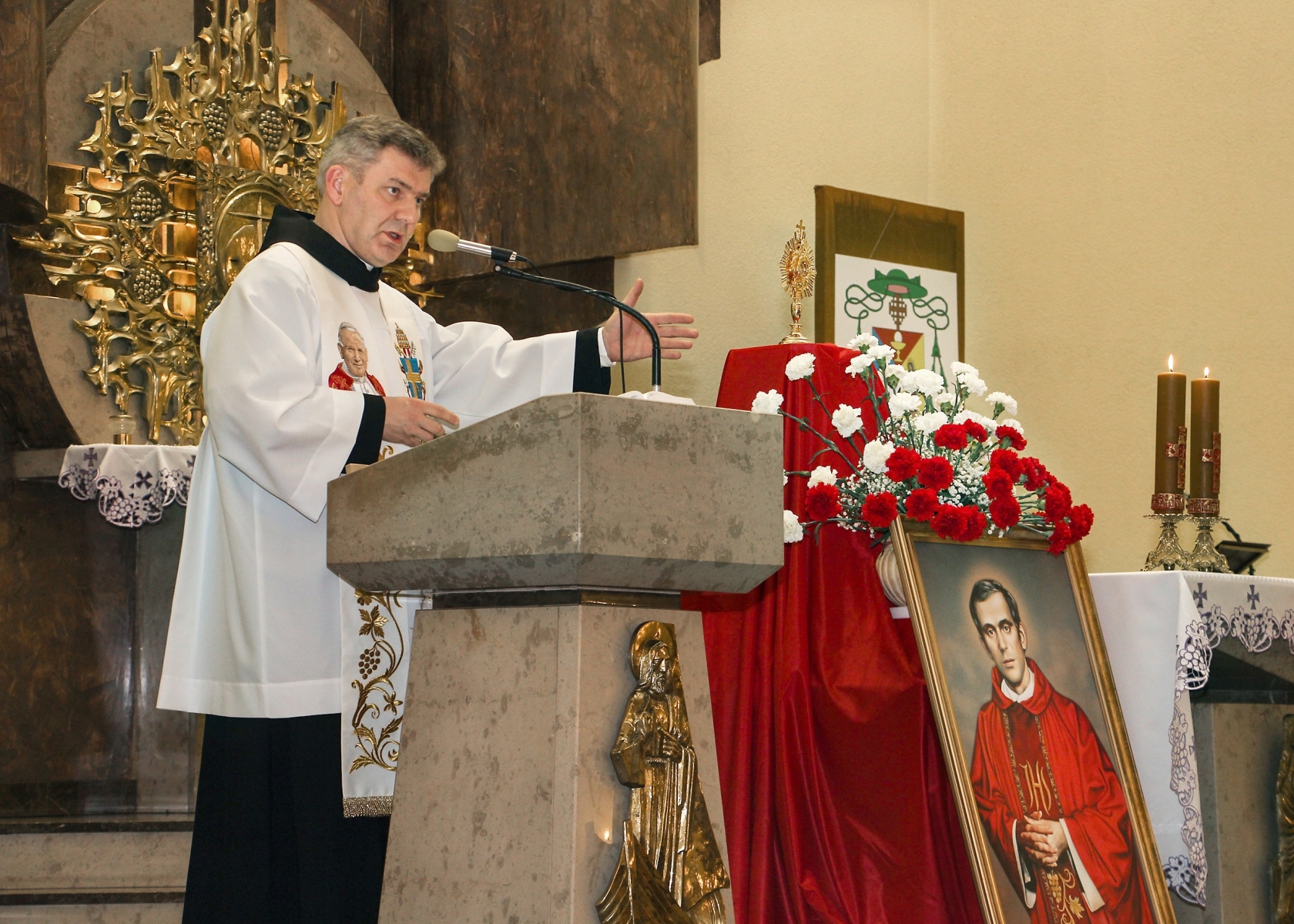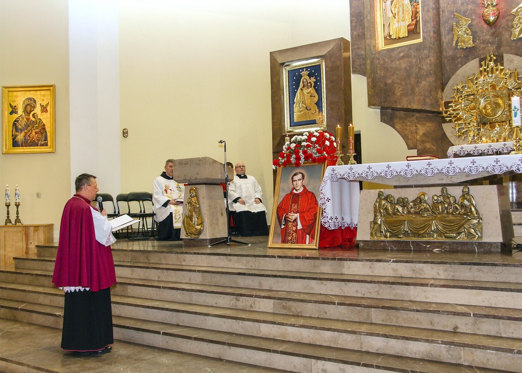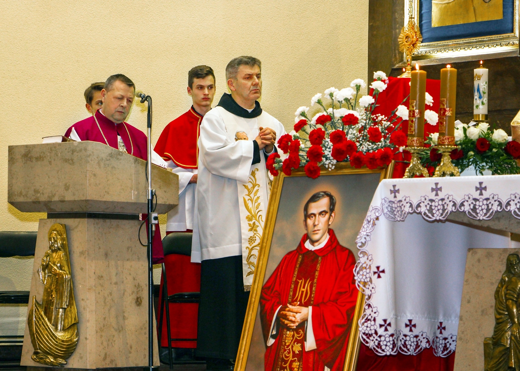 Była to – jak określił ks. Biskup – piękna, dostojna i szlachetna uroczystość. Jej centralną postacią był męczennik naszych czasów, wierny syn Kościoła i naszej Ojczyzny, naśladowca Jezusa Chrystusa cierpiącego i Ukrzyżowanego – ks. Jerzy Popiełuszko. Wielu parafian pamięta ks. Jerzego. Historię Jego życia, pracy duszpasterskiej, porwania i tragicznej śmierci Wielu pamięta stan wojenny, powstanie Solidarności, modlitwy za Ojczyznę i cały ten dramatyczny okres naszej historii. Dla ks. Proboszcza Prałata Stanisława Płaszczyka była to szczególnie wzruszająca chwila, bowiem w relikwiach ks. Jerzego przywitał w kościele parafialnym swojego Kolegę z wojska. Poruszające było więc jego osobiste świadectwo o ks. Jerzym z czasów ich wspólnej służby wojskowej. Zapowiedział również, że każdego 19 dnia miesiąca będziemy modlić się przed relikwiami Męczennika w intencjach parafii, Ojczyzny i naszych osobistych. Ks. Prałat Tomasz Kaczmarek opowiedział o szybko rozwijającym się kulcie bł. ks. Jerzego w Polsce i w świecie, o licznych cudach za jego wstawiennictwem i radości z rozpoczęcia procesu kanonizacyjnego.