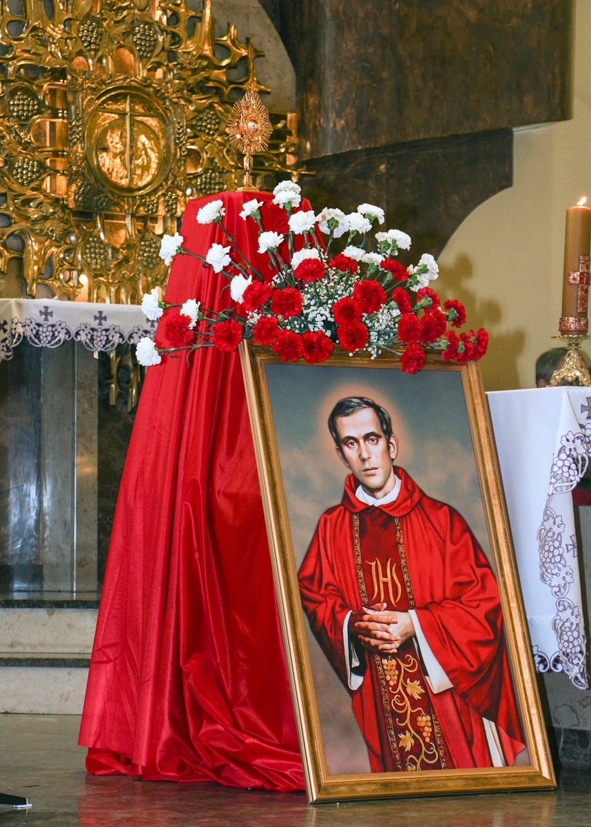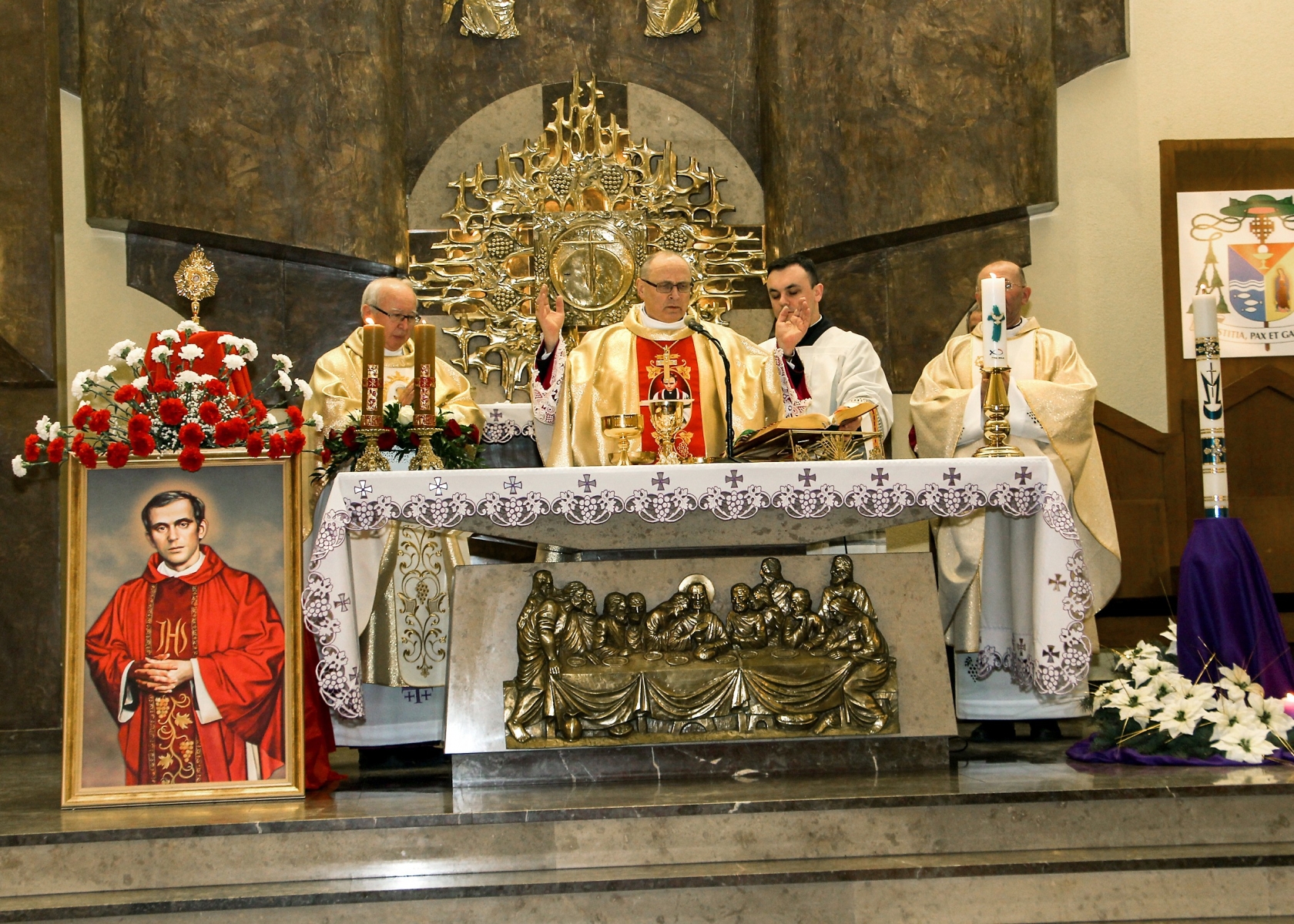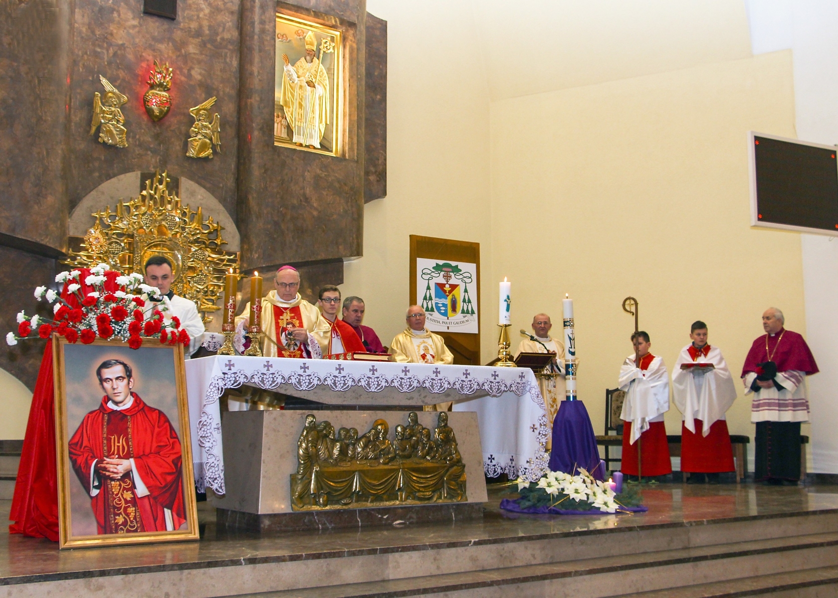 Była to – jak określił ks. Biskup – piękna, dostojna i szlachetna uroczystość. Jej centralną postacią był męczennik naszych czasów, wierny syn Kościoła i naszej Ojczyzny, naśladowca Jezusa Chrystusa cierpiącego i Ukrzyżowanego – ks. Jerzy Popiełuszko. Wielu parafian pamięta ks. Jerzego. Historię Jego życia, pracy duszpasterskiej, porwania i tragicznej śmierci Wielu pamięta stan wojenny, powstanie Solidarności, modlitwy za Ojczyznę i cały ten dramatyczny okres naszej historii. Dla ks. Proboszcza Prałata Stanisława Płaszczyka była to szczególnie wzruszająca chwila, bowiem w relikwiach ks. Jerzego przywitał w kościele parafialnym swojego Kolegę z wojska. Poruszające było więc jego osobiste świadectwo o ks. Jerzym z czasów ich wspólnej służby wojskowej. Zapowiedział również, że każdego 19 dnia miesiąca będziemy modlić się przed relikwiami Męczennika w intencjach parafii, Ojczyzny i naszych osobistych. Ks. Prałat Tomasz Kaczmarek opowiedział o szybko rozwijającym się kulcie bł. ks. Jerzego w Polsce i w świecie, o licznych cudach za jego wstawiennictwem i radości z rozpoczęcia procesu kanonizacyjnego.