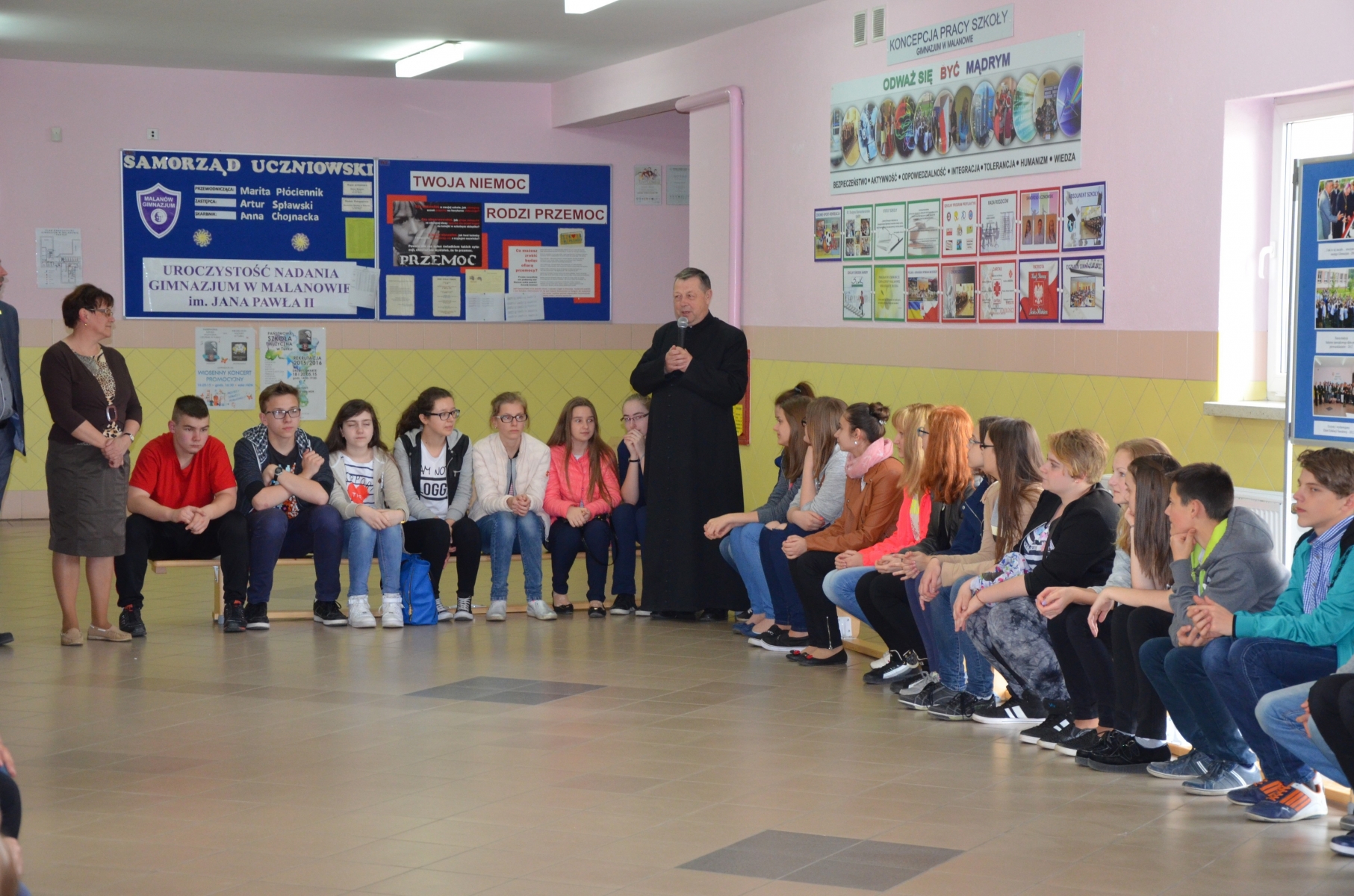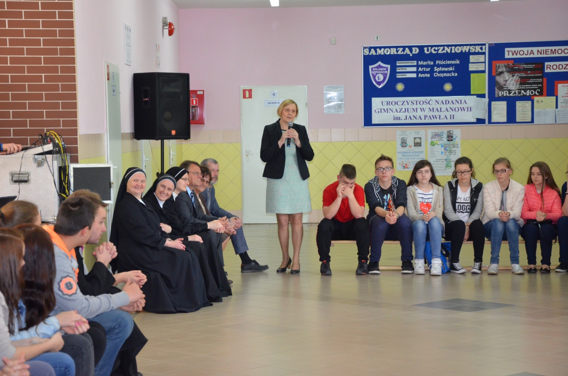 W sobotę 16 maja młodzież naszej parafii zgromadziła się w gimnazjum, by wziąć udział w warsztatach ewangelizacyjnych prowadzonych przez Siostry Prezentki : Bernardetę Żygadło ze Świdnicy oraz Katarzynę Szuba i Hiacyntę Dorula z Krakowa. Na spotkanie przybyli nasi szanowni goście, przyjaciele młodzieży: ks. Prałat Stanisław Płaszczyk, Wójt gminy Malanów Sławomir Prentczyński i Przewodniczący Rady p. Andrzej Toms, pani Dyrektor gimnazjum Krystyna Sobczak i p. Wice Dyrektor Agnieszka Stawicka. Pan Wójt wyraził radość z tej inicjatywy i zapewnił nas o pomocy ze strony samorządu gminnego. Ks. Prałat – nasz proboszcz pobłogosławił II Spotkanie Młodych w Malanowie.