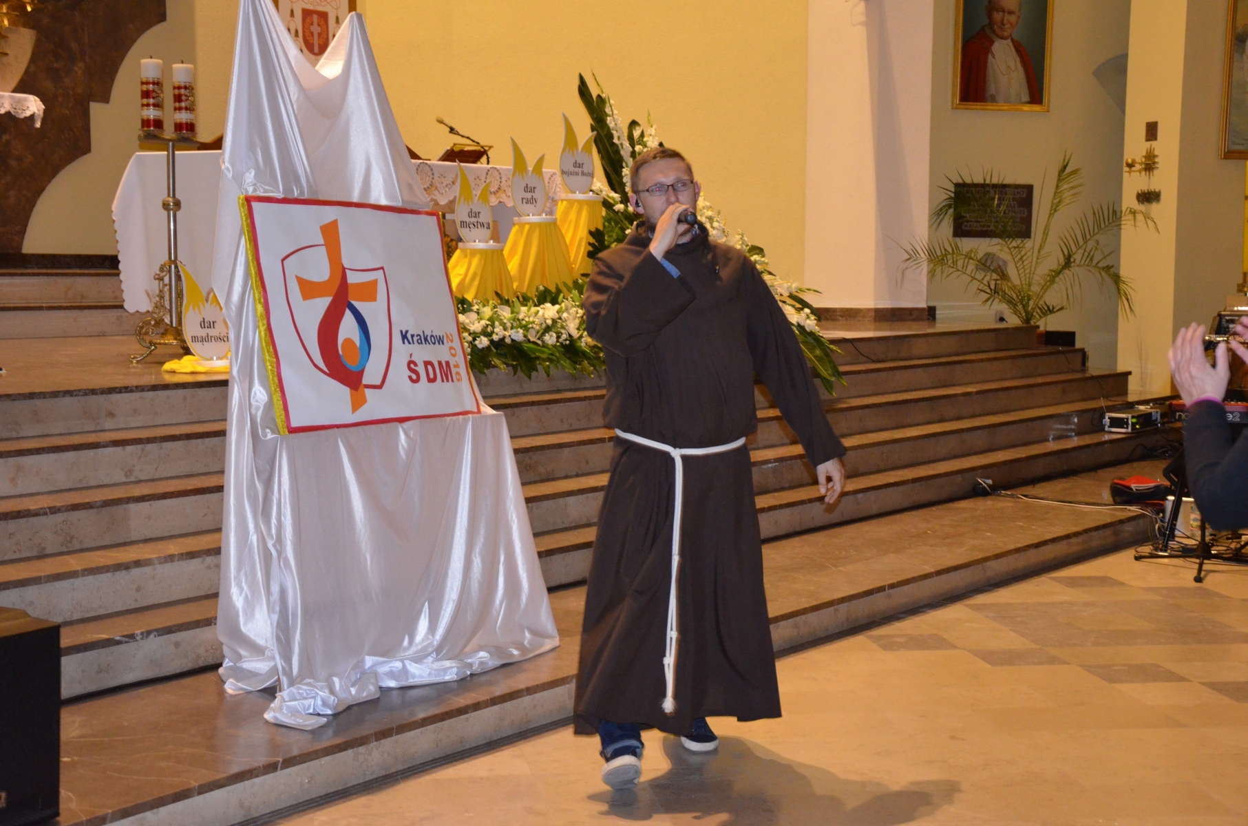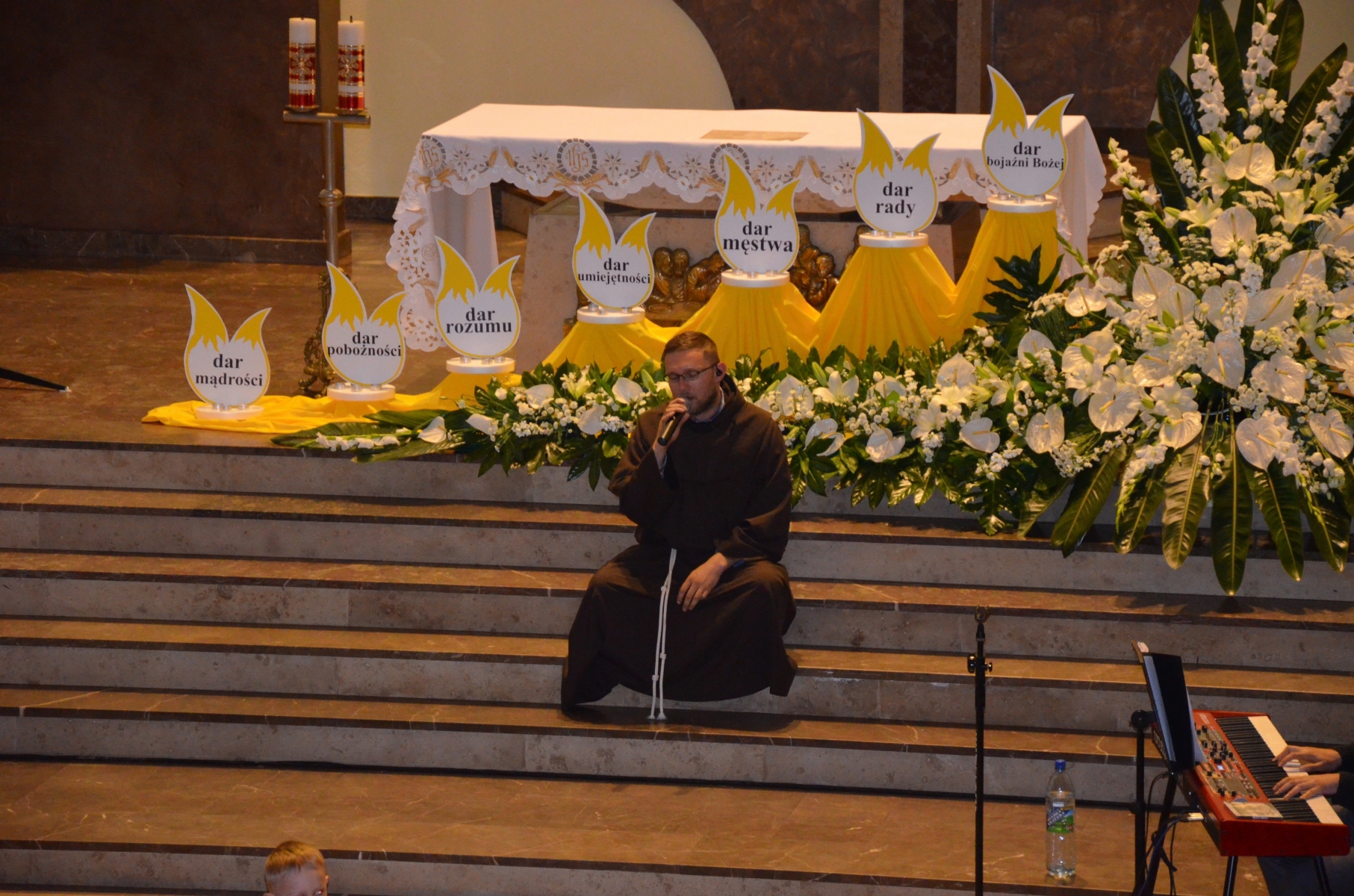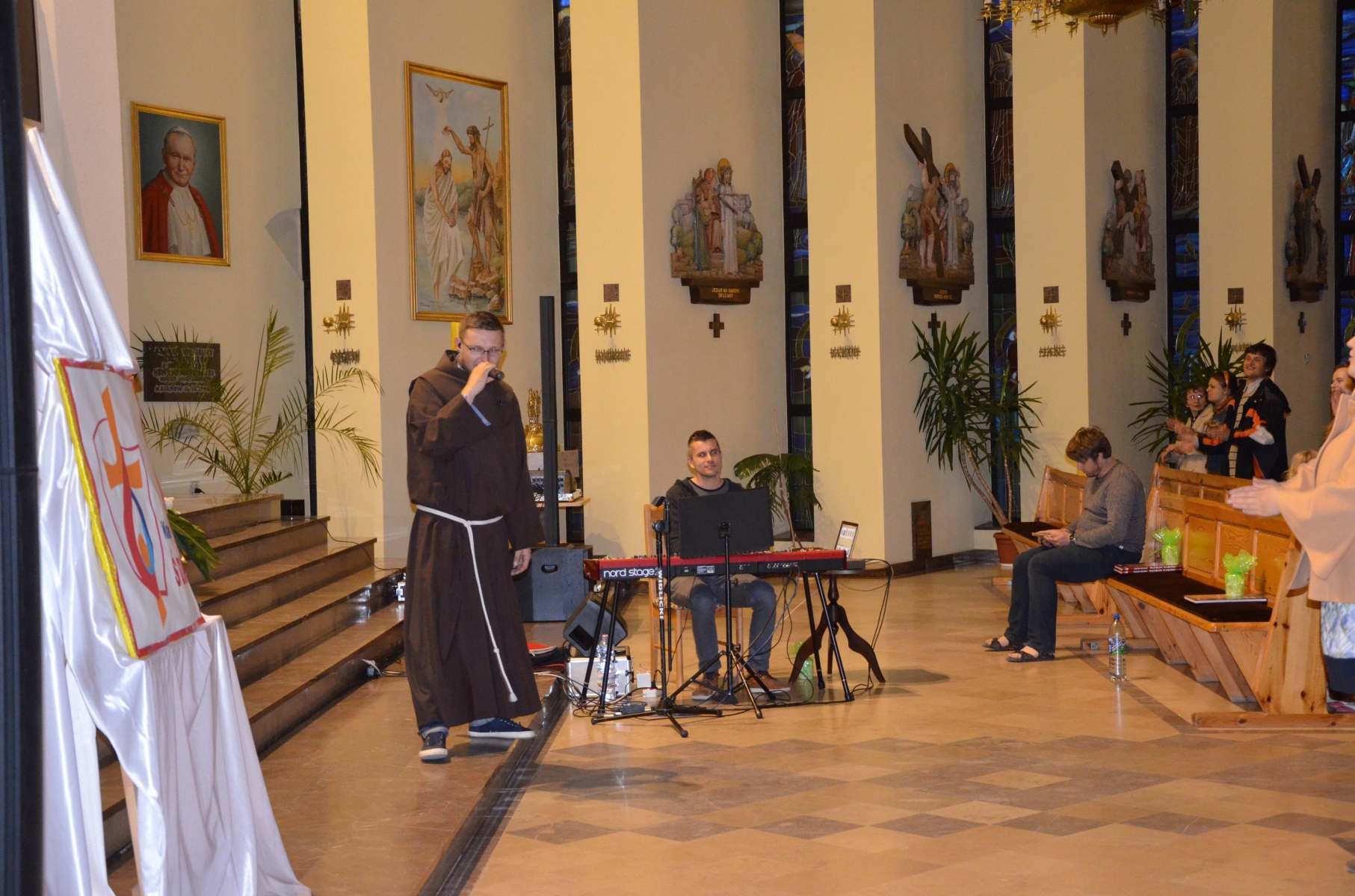 Wieczorem jeszcze raz się spotkaliśmy w naszej świątyni. Tym razem na koncercie ewangelizacyjnym Ojca Łukasza Buksy OFM. Ojciec Łukasz prowadzi akcję wśród młodzieży „Obudź się możesz więcej”. Swoimi koncertami rozbudza młode serca do poszukiwania w sobie nowych inspiracji do pięknego życia wykorzystując dary otrzymane od Stwórcy. W naszej wspólnocie utworami z nowej płyty „Możesz więcej” Ojciec Łukasz wprowadził nas w atmosferę uwielbiania Boga i wiary w Jego żywą obecność. Z Jezusem możemy więcej i nie ważne ile mamy lat, nie ważne jakie mamy trudności, kłopoty, problemy. Z Jezusem zwyciężymy . Radość udzieliła się wszystkim uczestnikom koncertu. Śpiewaliśmy, klaskaliśmy i tańczyliśmy w rytm muzyki. Serca nasze „podskakiwały” z radości i wdzięczności. Wieczór ewangelizacyjny pobudził nas do działania, do nadziei że warto pięknie żyć, bo mamy Jezusa naszego Przyjaciela.