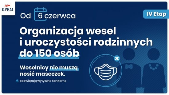 Jest też dobra wiadomość dla narzeczonych. Od 6 czerwca mogą się odbywać wesela i uroczystości rodzinne do 150 osób. Weselnicy nie muszą zakładać maseczek.