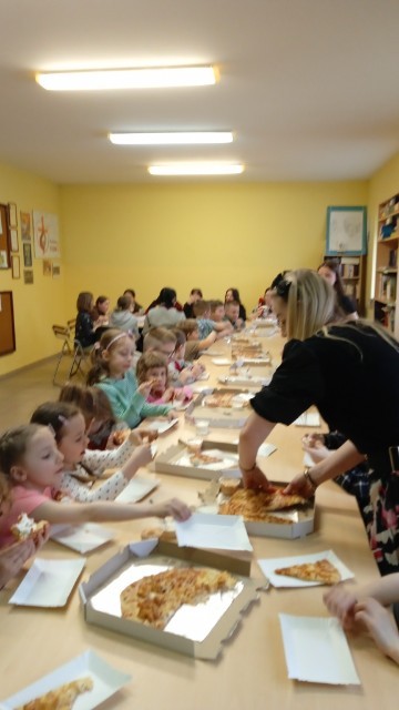 Spotkanie rozpoczęliśmy w naszym kościele. Przy obrazie Jezusa Miłosiernego ks. Mariusz Smoliński poprowadził koronkę do Bożego Miłosierdzia oraz modlitwę ostatniego dnia nowenny do Bożego Miłosierdzia. Następnie w salce podzieliliśmy się jajkiem i złożyliśmy sobie życzenia. Harcerze poprowadzili wspólną zabawę. Było bardzo wesoło jak przystało na czas wielkanocny. Jedliśmy ciasto upieczone przez nasze dziewczynki ze starszej grupy Lenkę, Nikolę, Maję i Gabrysię oraz pizzę. Na koniec każdy otrzymał obrazek Jezu ufam Tobie oraz modlitwę zawierzenia Matce Bożej i św. Józefowi. Były też „Boże kanapki” czyli Słowo Boże. Dziękujemy Panu Jezusowi Miłosiernemu za łaskę tego spotkania i wszystkim, którzy chcieli się razem w imię Boże się spotkać.