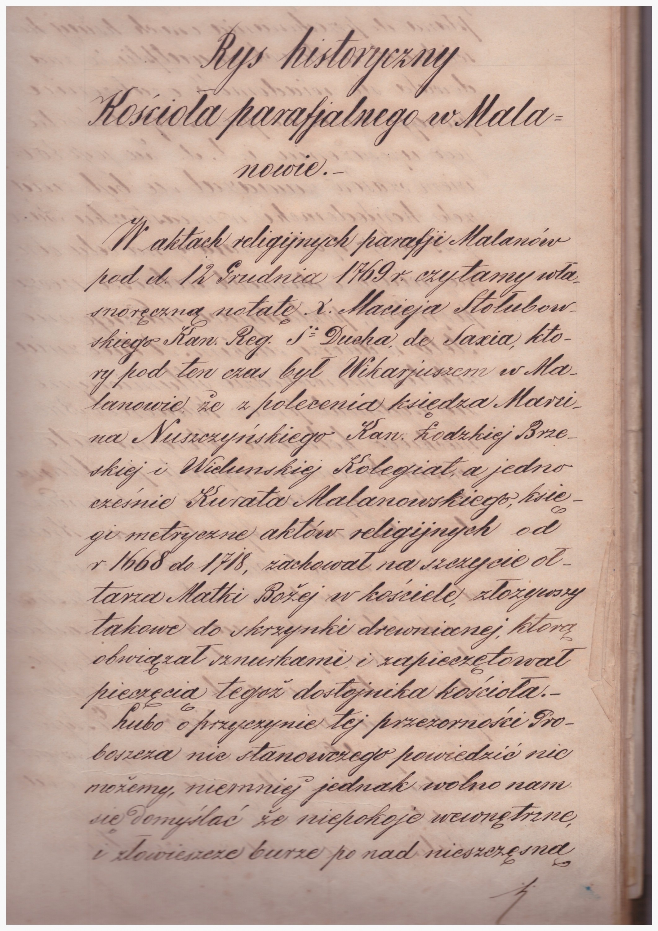 W archiwum parafialnym znajdują się księgi z rysem historycznym Kościoła Parafialnego oraz Parafii Malanów z 1891 r. Oto fragment: